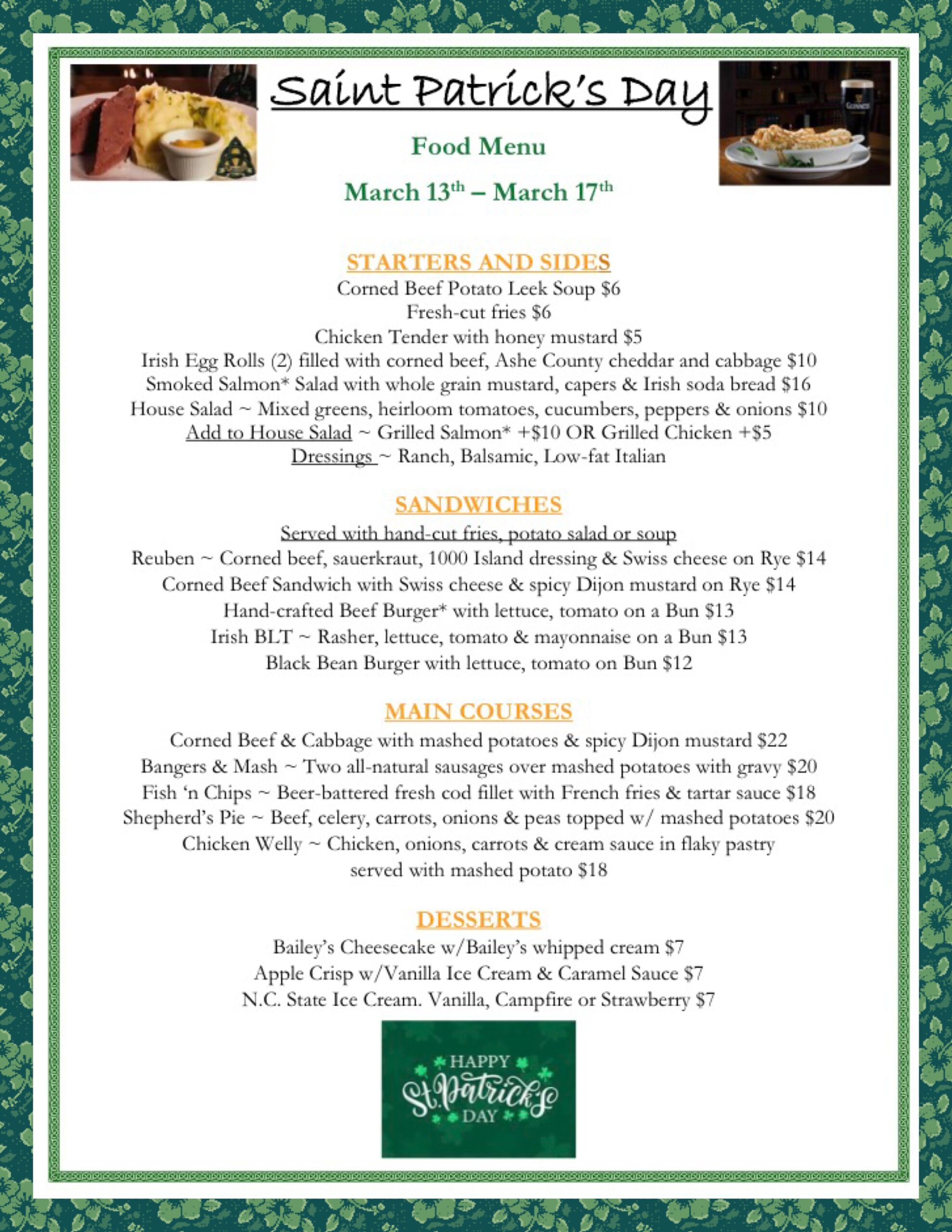 AUTHENTIC IRISH COOKING BY THE ONLY IRISH CHEF IN THE TRIANGLE Enter here for Saint Patrick’s Day A True Slice of Ireland GREAT FOOD, BEER AND AMAZING HOSPITALITY Buy aGift Card COME OVER AND ENJOY LIVE SPORTS LEARN MORE